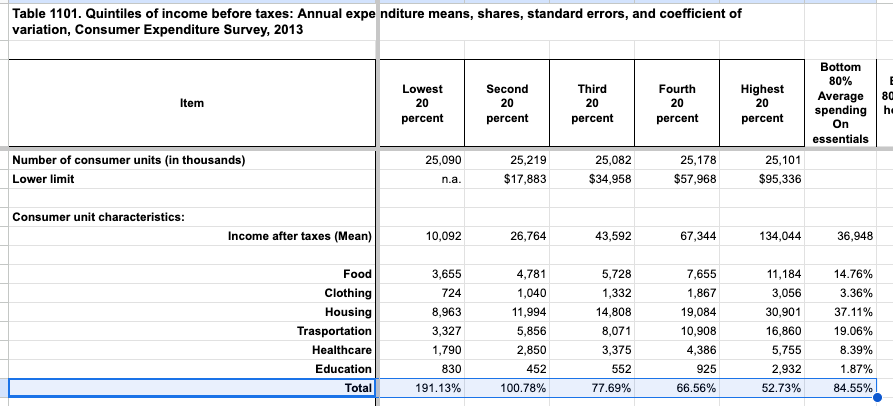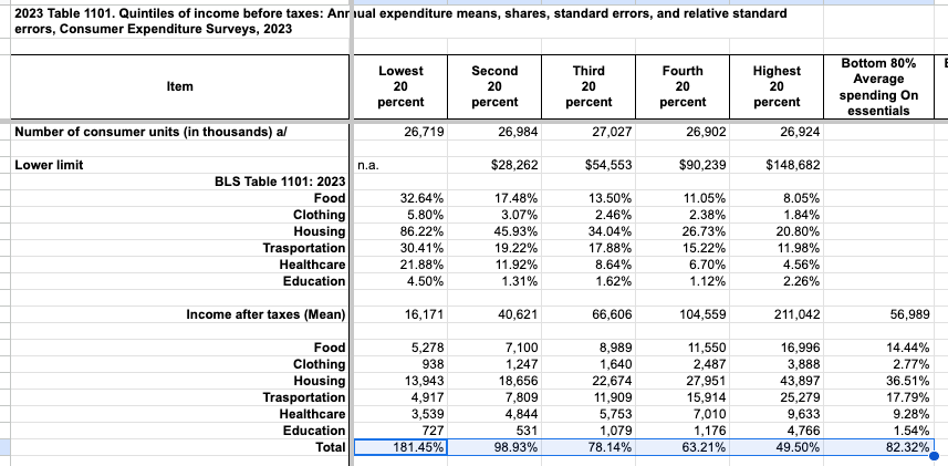 The Bureau of Labor Statistics' own data shows that families in the bottom 80% spend more than they earn just on necessities—before accounting for anything else. This isn't overconsumption; it's mathematical impossibility sustained only through debt.