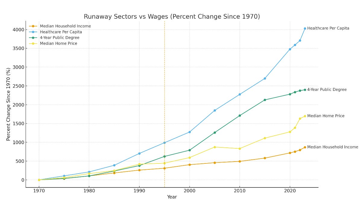 So where did all the prosperity go? It didn't vanish. It was taken. Housing, healthcare, education, transportation, and food make up the bulk of our spending. And corporations have gobbled it up.