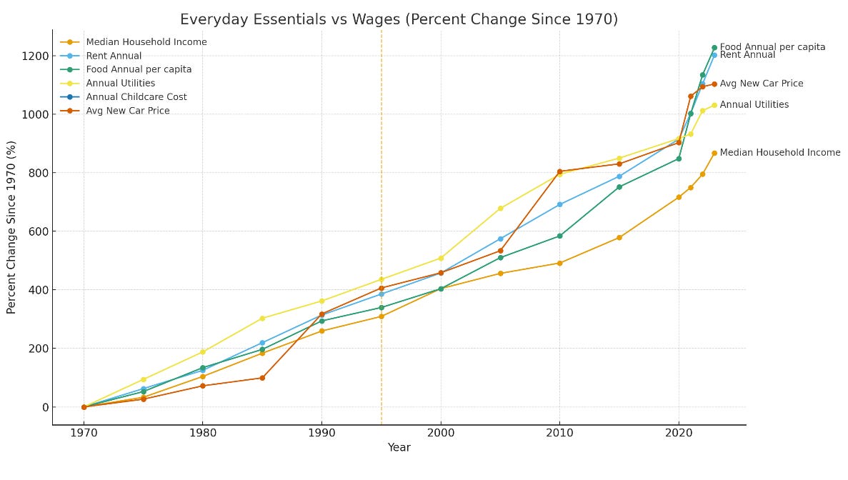 The average family now spends $13,174 annually on transportation—more than double what most people think. Childcare costs average $11,582 per year, often exceeding college tuition. We're spending more on basic necessities than we earn.