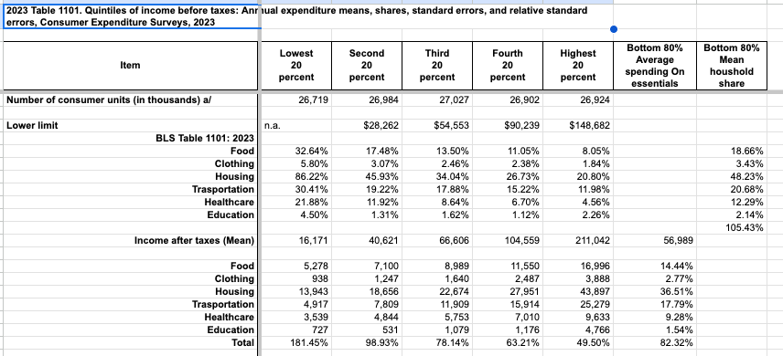This chart shows you how consumers spend their income. As you can see the bottom 80% of households spend most of their income on the essentials that are being undercounted: food, clothing, shelter, transportation, healthcare, and education.