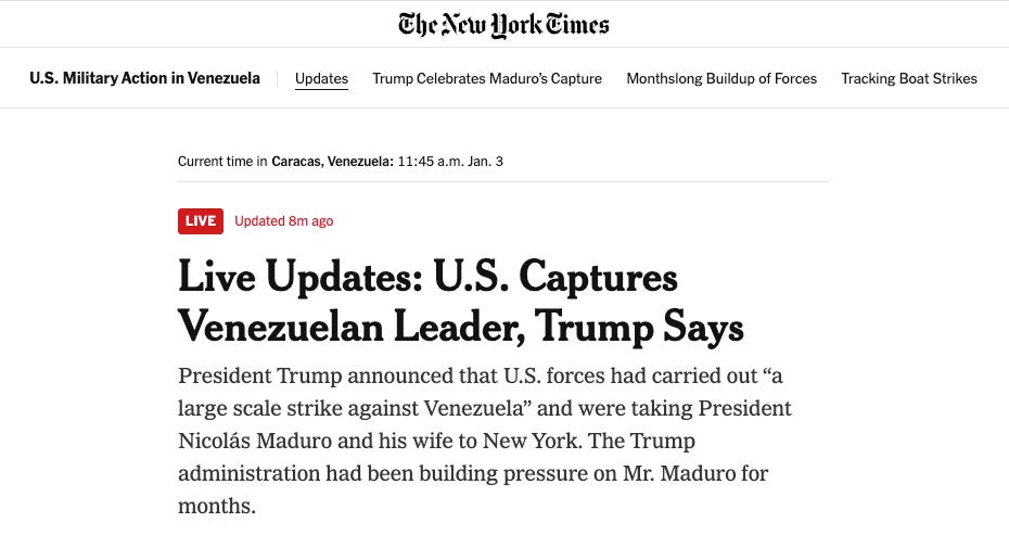 This morning I woke up to the New York Times telling me the United States had “captured” the president of Venezuela.